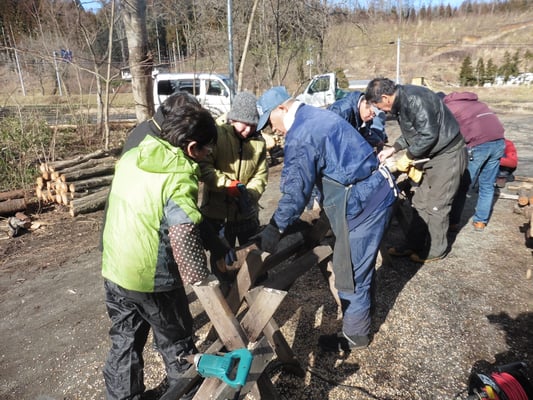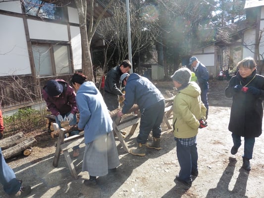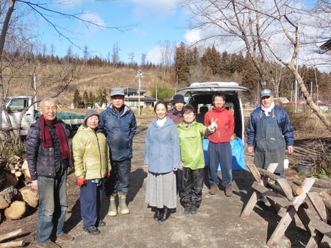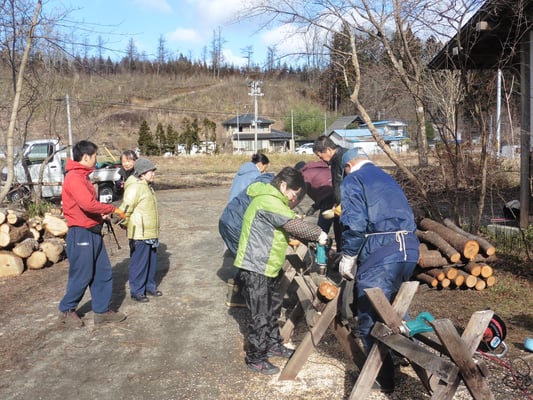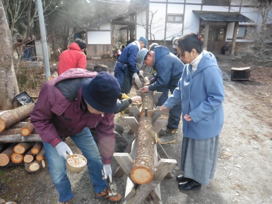 ●内容 今年の冬は雪が少なく、日中は曇りがちの天気でしたが、暖かくアウトドア作業にはもってこいの日でした。はじめて体験する方もおりましたが、ドリルで穴開け後、なめこ・ひらたけの菌を打ち込み完成です。参加者はすっかり慣れて楽しく、和気あいあいと植菌作業を行いました。今後の管理ですが、直射日光の当たらない場所(例:庭の日蔭)に地面に仮伏せしておいてください。菌が回りやすくするために保温用として古い毛布等をかぶせて、時々散水してやってください。今年の春(5~6月)になりましたなら、今度は本伏せとなります。しいたけと違い、地面に直接伏せて、ほだ木は動かさないで、伏せて管理してください。原木キノコのおいしさをぜひとも味わってください。参加された方々ごくろうさまでした。本物のきのこの感触を楽しんでください。不明な点があれば気軽にメール(oomura.masami@mou.ne.jp)及び携帯(090-5848-7417)まで連絡してください。