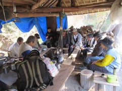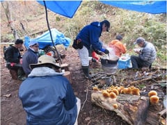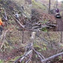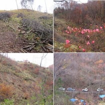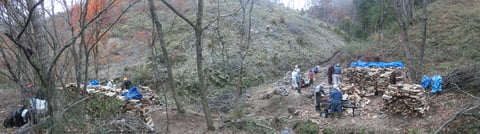 ●内容 北側沢沿いの伐倒木、柴類片づけ。しっかり濡れた太めの柴を何名かの方がひきとって下さいました。放置すればごみ、乾燥させて燃せば資源です。お蔭で山が綺麗になりました。期待ニ反してずっと小雨/霧雨でしたが、風はなく、作業は可でした。お昼にはジウンドウ鍋をおいしくいただきましたが、早めに切り上げて午後の作業を始め。早めに終了しました。