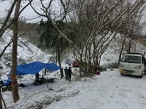 今年になって二度目のB作業の日、それと今日は「会の新年会」でもある。暴風雪が騒がれていましたが、山はそれ程でなく、粉雪が舞う寒い一日でした。山道の雪も軽トラが少しスル程度で難なく入れました。でも山道の痛みは著しく補修が必要な感じです。今日の作業は、麓の薪棚にはストックが殆どなく山からの薪運び、新たな伐採地での掛け橋材準備(貯水槽入口付近まで搬出)や新規休憩小屋等の建材購入保管(野縁材90本と下地用合板90枚を理事長宅の納屋借用)、を行いました。一般社団法人パーソナルサポートセンターから2名お手伝いを頂き、ありがとうございました。
