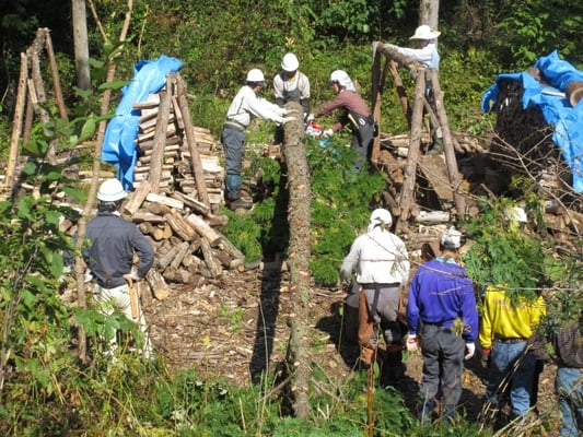 ●内容 ①18日開催するイベント用に檜1本を伐倒し、丸太の玉切り及び丸太ストーブを製作を行いました。②山腹のシュターの撤去、かたずけ。
