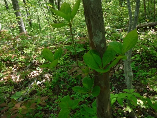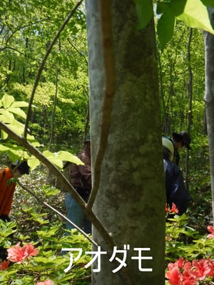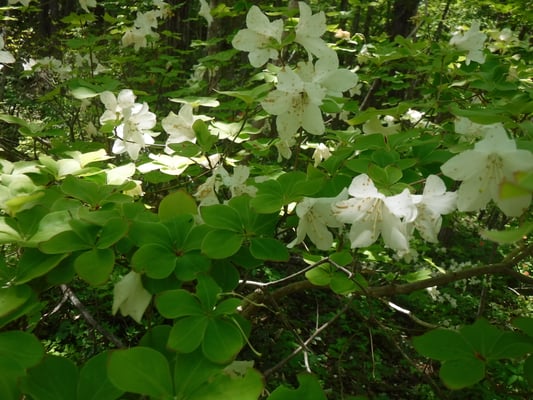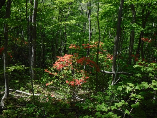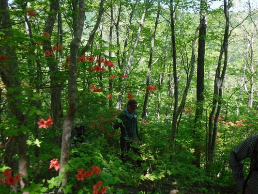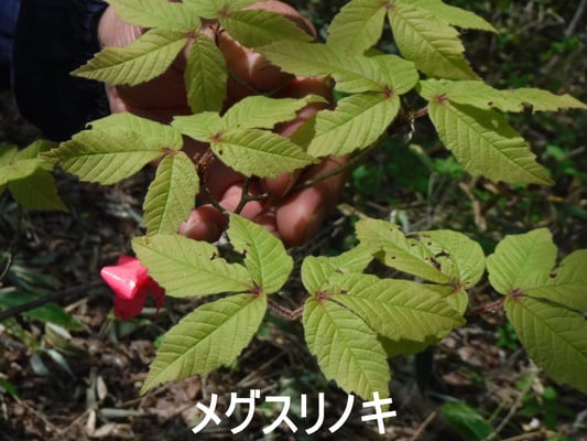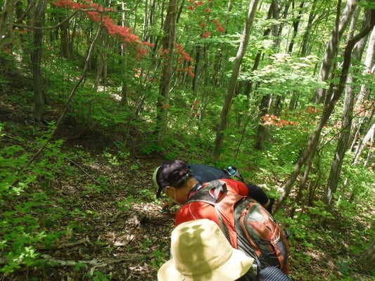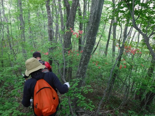 ⇩頂上の手代塚山(標高570m:GPS時計計測)を目指し、樹木・山野草の名前を案内人のレクチャを受けながら、全員で気持ちよい汗をかいて緑の風と光のシャワーを浴びながら散策することができました。頂上では山ツツジ(オレンジ色)やヤシロツツジ(白色)が咲き誇っていました。