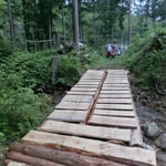 日差しはさほど強くはないが、日影が無い山頂付近はウダル暑さで日射病寸前でした。軽架線のワイヤーの接続延長も進み、本格的な玉切り材降ろしが始まろうとしています。前回の第三の橋架け作業途中を渡り板製板と橋の前後の傾斜整備・渡り板張り付け、開通式を行いました。一般社団法人パーソナルサポートセンターから三名が一日お手伝いを頂き、ありがとうございました。本日のB作業に参加されました方々、お疲れ様でした。