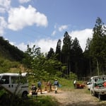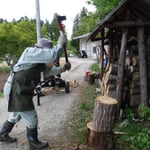 朝は雷雨で荒れ模様、午後は晴れの予報だったので山へ出かける事にしました。半信半疑で十一名のメンバーが集まりました。10時過ぎには雨が上がり、作業開始。今日は、前回導入したシューターの増設及びトライ、22t薪割り機タイヤ(チューブレス)空気抜け修理、破損した薪棚解体、の特記作業と、玉切り・運搬・薪割り・整理の定期作業を今日の作業にしました。